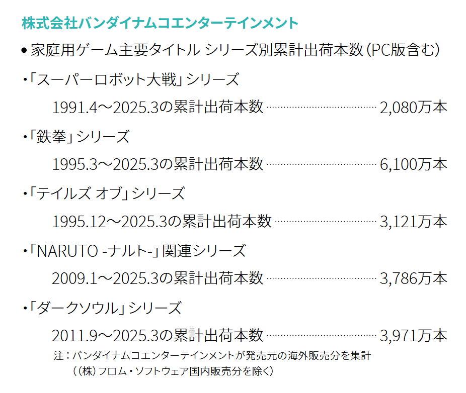 株式会社万代南梦宫控股公司在2025年11月6日公开的资料《综合报告书2025 / 指南书2025》中记载,动作角色扮演游戏《黑暗之魂》系列截至2025年3月底海外累计出货量达到3971万份。这个数字不包括FromSoftware销售的国内版。