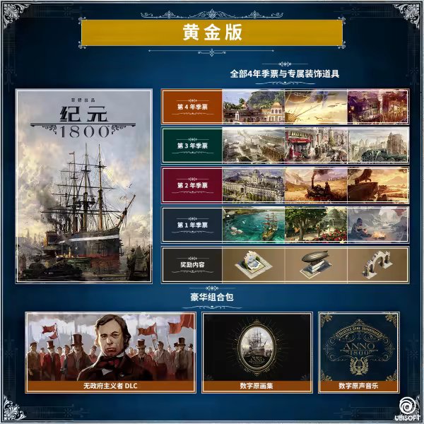 使用黄金版,解锁完整的《纪元 1800》游戏体验,该版本内含:
